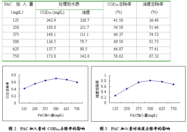 表3 PAC聚合氯化鋁加入量對(duì)CODCr、濁度去除率的影響